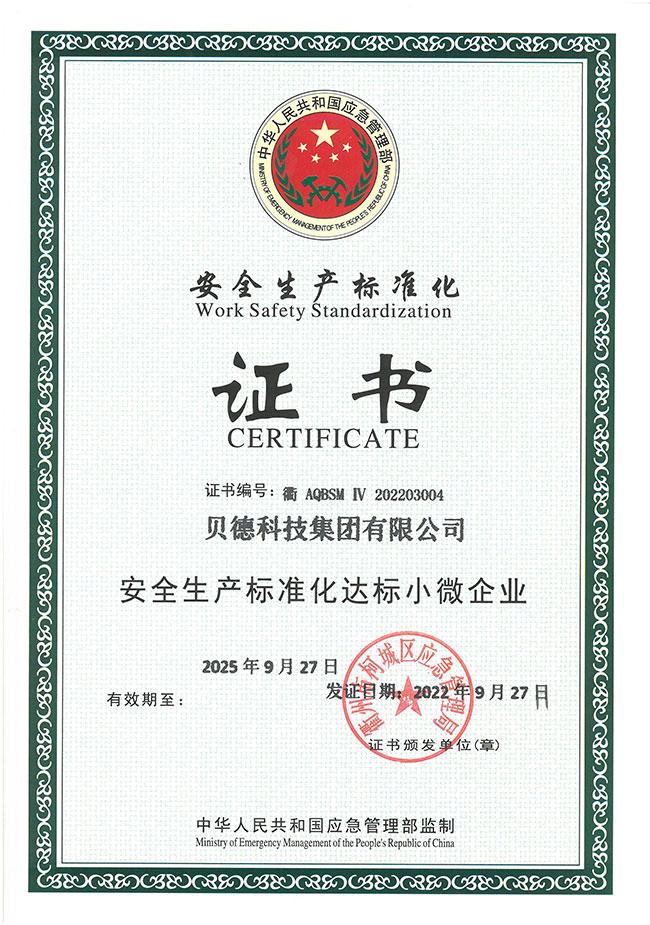 安全生產(chǎn)管理邁上新臺階,貝德科技集團喜獲“安全生產(chǎn)標準化達標小微企業(yè)”證書