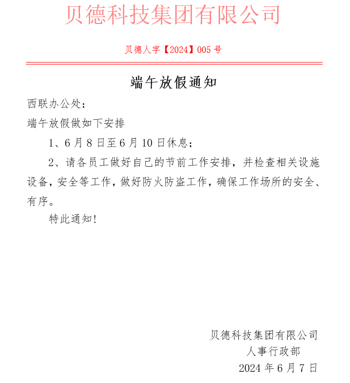 2024年端午節(jié)貝德科技集團(tuán)放假通知